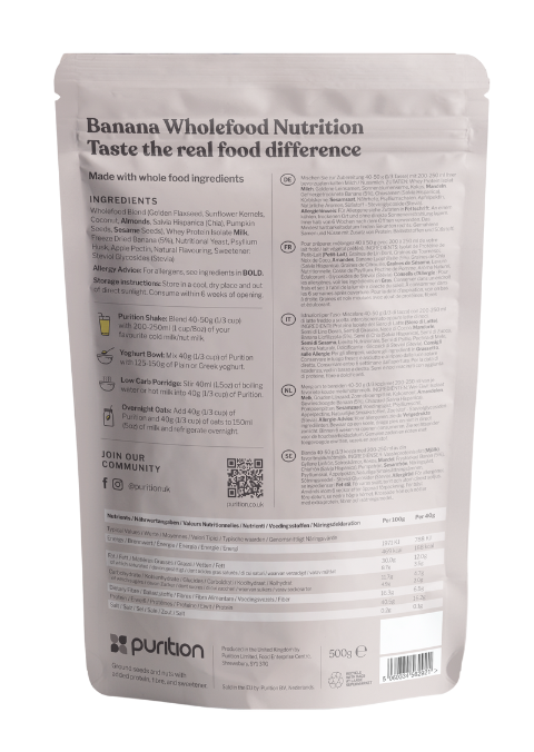 Wholefood Blend (Golden Flaxseed, Sunflower Kernels, Almonds, Coconut, Salvia Hispanica (Chia), Pumpkin Seeds, Sesame Seeds), Protein Blend (Pea Protein Isolate, Fava Bean Isolate, Fava Bean Concentrate), Freeze Dried Banana (4%), Nutritional Yeast, Psyllium Husk, Apple Pectin, Natural Flavouring, Sweetener: Steviol Glycosides (Stevia). Allergy Advice: For allergens, see ingredients in BOLD.
